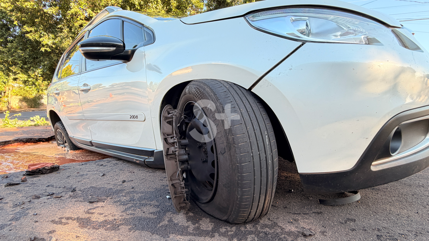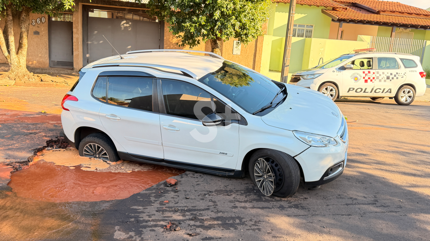 Um automóvel Peugeot 2008 caiu em um buraco aberto no asfalto após um vazamento de água, antes do amanhecer desta segunda-feira (2), em Adamantina (assista). Apesar do susto e dos prejuízos materiais, ninguém ficou ferido.