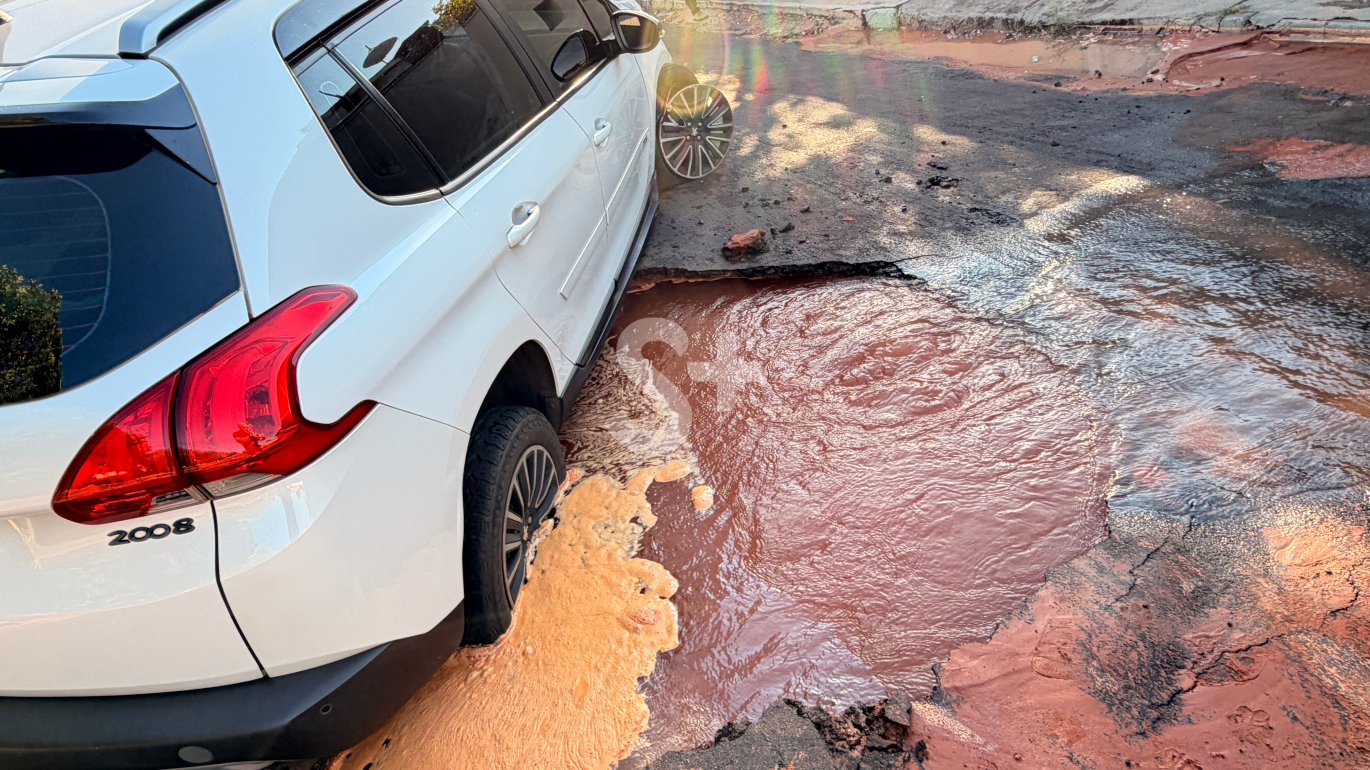 Carro cai em buraco aberto por vazamento de água em rua de Adamantina