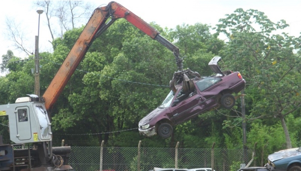 São cerca de 170 toneladas de carros e motos que foram a leilão público, mas não houve interessados em comprar e agora terão as ferragens amassadas e transformadas em placas para serem utilizadas em setores como o próprio automobilístico.
