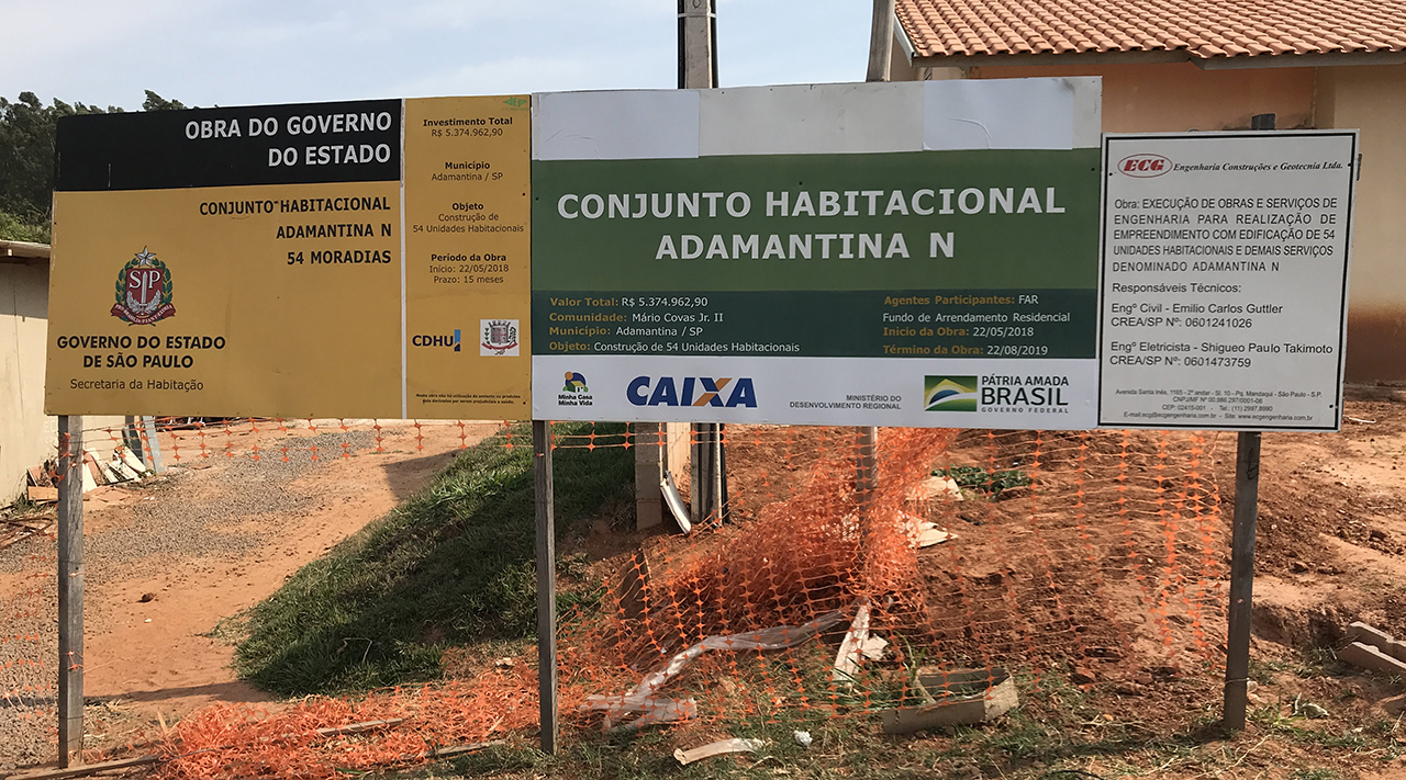 Já em relação às obras do conjunto Adamantina N, a Caixa informa que as 54 casas estão em fase final de obras e legalização, com previsão de entrega para outubro de 2020. Pelo local, as casas estão praticamente concluídas, restando ainda finalizar a implantação das redes de energia elétrica e iluminação pública, bem como as obras de galerias pluviais, guias, sarjetas, calçadas e pavimentação asfáltica. O valor total dessa obra é de R$ 5.374.962,90, tendo sido iniciada em 22 de maio de 2018, com previsão de término para 22 de agosto de 2019.