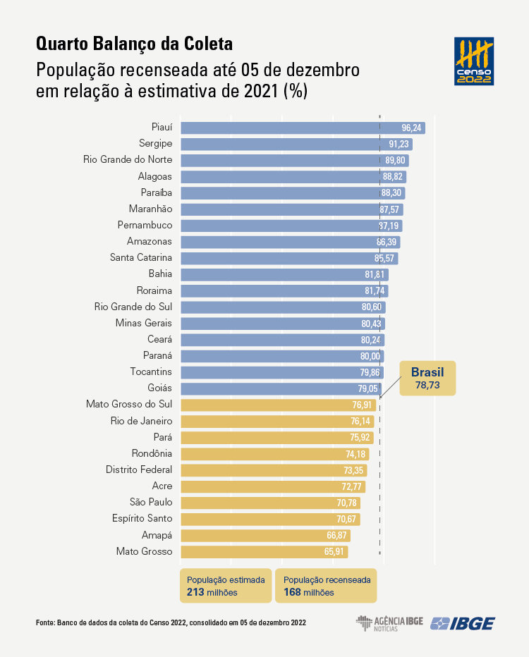 Segundo o IBGE, o estado com maior proporção de pessoas recenseadas na comparação com a população estimada é o Piauí, que atingiu 96,2%. Em segundo lugar, a unidade da federação mais adiantada é Sergipe, com 91,2%, seguida do Rio Grande do Norte, com 89,8%. Os mais atrasados são o Mato Grosso (65,9%), Amapá (66,9%) e Espírito Santo (70,67%).