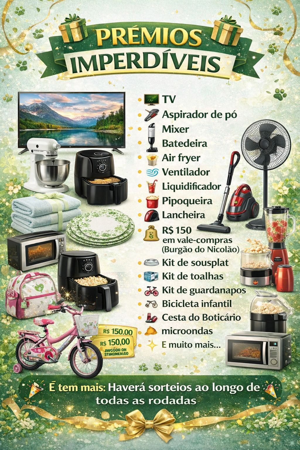 Durante o evento, os participantes poderão concorrer a uma série de prêmios, incluindo itens domésticos e eletroportáteis, como televisão, air fryer, aspirador de pó, ventilador, liquidificador, mixer, batedeira, pipoqueira e micro-ondas. Também estão entre os brindes bicicleta infantil, kits de cozinha e utilidades, além de vale-compras no valor de R$ 150. Sorteios extras também estão previstos ao longo da programação.