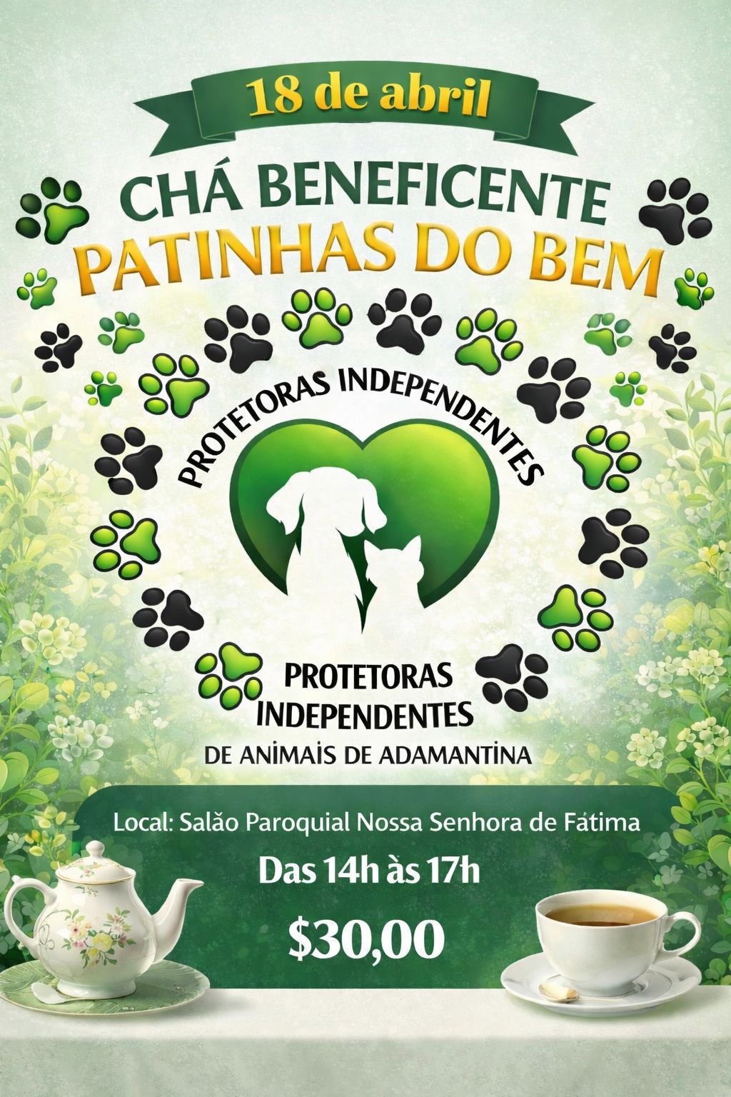 Um grupo de protetoras independentes de animais de Adamantina promove neste sábado (18) o “Chá Beneficente Patinhas do Bem”, iniciativa solidária que busca arrecadar recursos para o cuidado de cães e gatos resgatados no município.