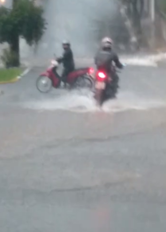 Motos tentam atravessar a rua alagada na Deputado Cunha Bueno (Reprodução).