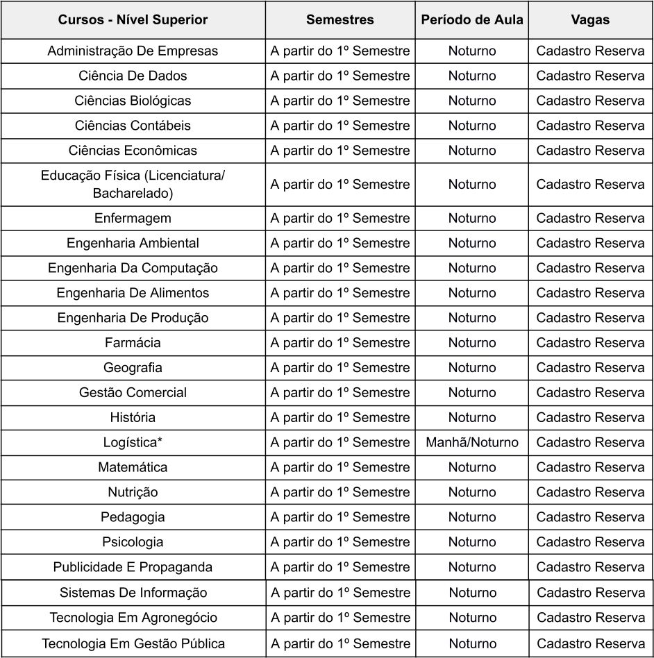 De acordo com o edital, a jornada será de até 30 horas semanais (6 horas diárias), com exceção do curso de logística, que terá carga reduzida de 20 horas semanais com bolsa proporcional.