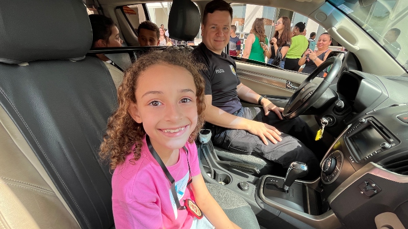 Um dos destaques da programação foi a possibilidade de passeio em viaturas oficiais da Polícia Civil. Em grupos, as crianças puderam realizaram o passeio nos veículos que se deslocaram pela cidade com ao dispositivos luminosos e sonoros ativados, o que ampliava as emoções dos participantes. Veja vídeo da atividade.