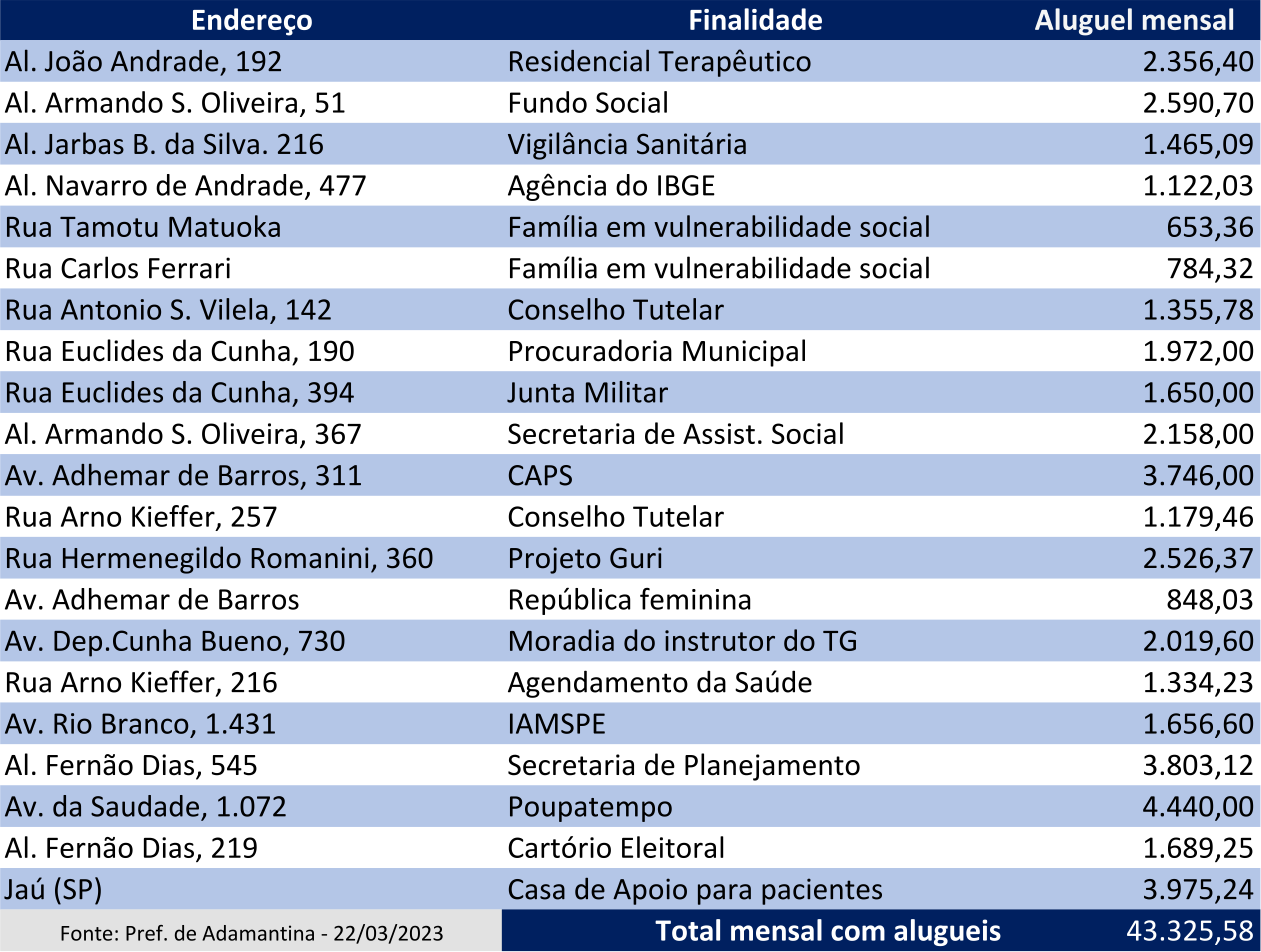 Enquanto a Prefeitura de Adamantina tem imóveis fechados, o município tem uma despesa mensal de R$ 43.325,58 com alugueis de 21 imóveis para abrigar órgãos públicos e serviços (lista abaixo). Os dados mais atualizados foram obtidos na última semana, após solicitação do SIGA MAIS ao poder público municipal, por meio da Lei de Acesso à Informação.