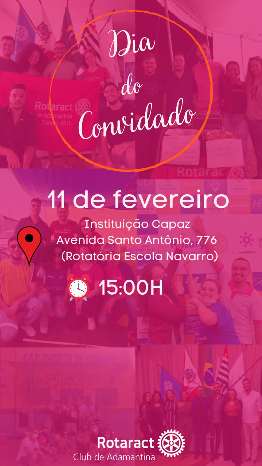 Conforme o Rotaract, o Dia do Convidado será neste sábado às 15h na sede da Instituição Capaz, que fica na Avenida Santo Antônio, 776 (na rotatória da Emef Navarro de Andrade), centro de Adamantina.
