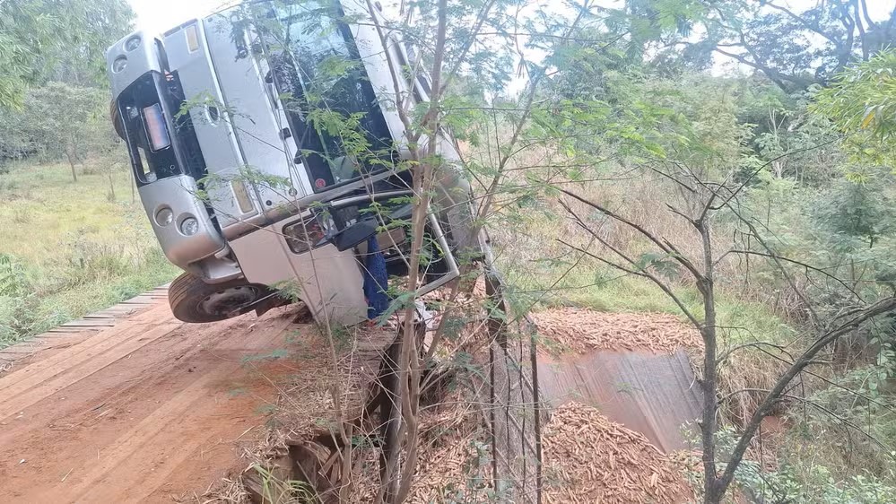 O condutor, de 54 anos, não se feriu. A carga de mandioca caiu no manancial enquanto o veículo ficou retido na estrutura que se rompeu durante a travessia.
