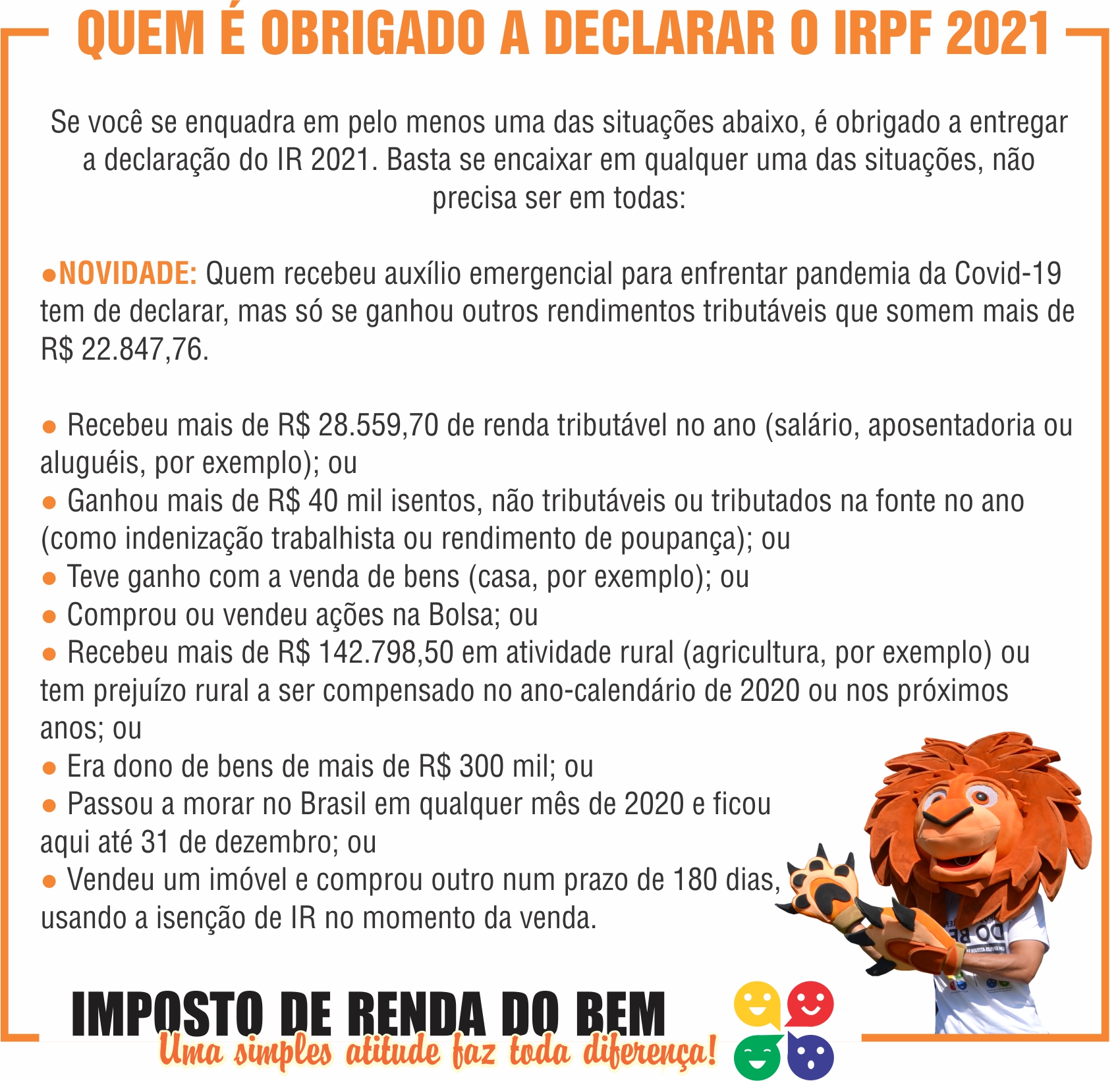Para fazer a doação, basta informar seu contador sobre o interesse de destinar os recursos para a Campanha Imposto de Renda do Bem, inciativa que faz toda a diferença e não gera nenhum gasto a mais ao contribuinte.