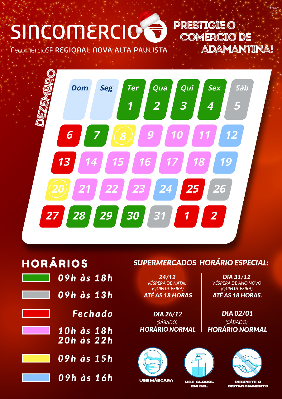 O comércio de Adamantina inicia nesta quarta-feira (9) seu funcionamento especial, com atendimento em horário noturno. Para este ano, diante das medidas de restrição decorrentes da pandemia da Covid-19, e em cumprimento à fase amarela do Plano São Paulo – que limita o funcionamento diário do comércio em no máximo dez horas – o horário local, neste fim de ano, seguiu novos parâmetros.