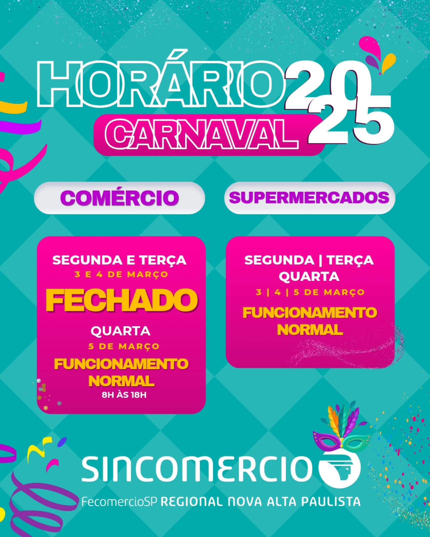 O comércio de Adamantina não abre na segunda-feira (3) e terça-feira (4), nos dias de carnaval. Já na quarta-feira de cinzas (5), o funcionamento normal, das 8h às 18h. A informação é do Sincomercio Nova Alta Paulista.