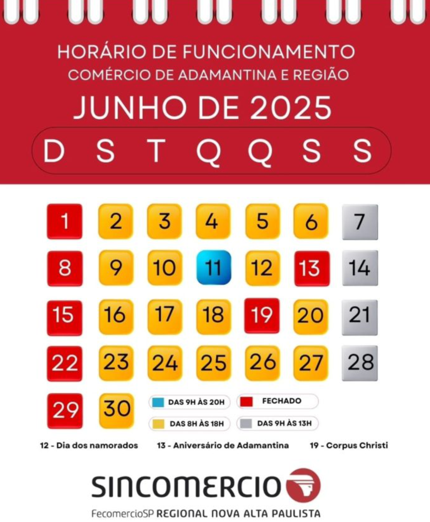 O comércio de Adamantina terá horários diferenciados neste mês de junho, em razão do Dia dos Namorados, do aniversário da cidade e do feriado de Corpus Christi. As datas e orientações foram divulgadas pelo Sincomercio Nova Alta Paulista, entidade que representa o setor varejista na região.