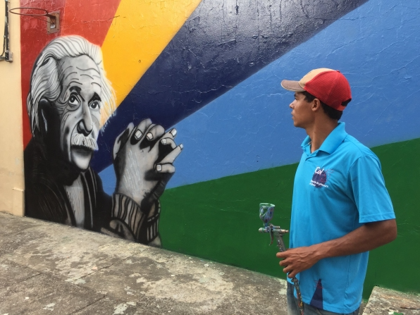 Depois, em março de 2018, uma nova reportagem sobre o arista mostrou o início de suas intervenções visuais em grandes painéis. Na ocasião ele realizava a pintura do rosto de Albert Einstein, nas dependências internas da Escola Estadual Helen Keller. Nesse novo projeto, onde atua até hoje, inspirou-se em grandes nomes do grafismo urbano, como Os Gêmeos e Eduardo Kobra.