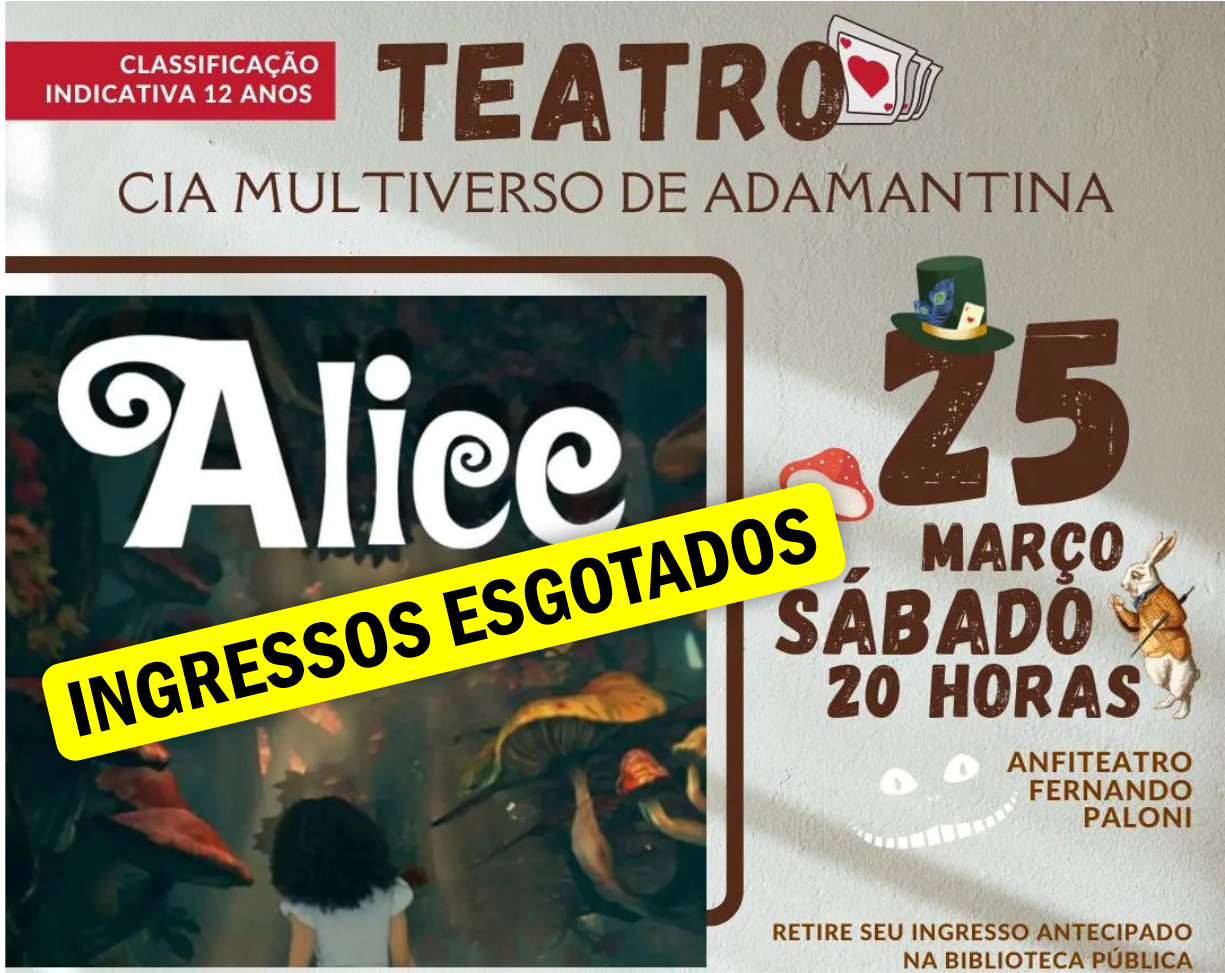 O final de semana em Adamantina está movimentado com atividades culturais. Sábado (25), a Cia Multiverso de Adamantina fará o espetáculo Alice a partir das 20h no Anfiteatro Fernando Paloni. Os ingressos estão esgotados.