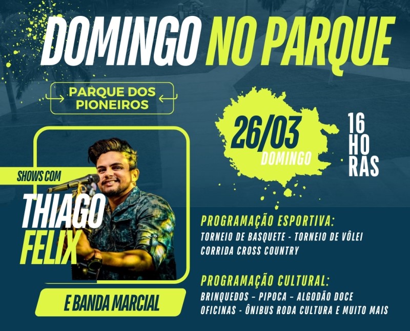 A programação esportiva trará torneio de basquete, vôlei e corrida cross country. As atividades culturais vão levar para o local oficinas, ônibus Roda Cultura, brinquedos infláveis e, ainda, a distribuição gratuita de pipoca e algodão doce. Durante o “Domingo no Parque”, ainda terão dois shows com a Banda Marcial de Adamantina e Thiago Felix.