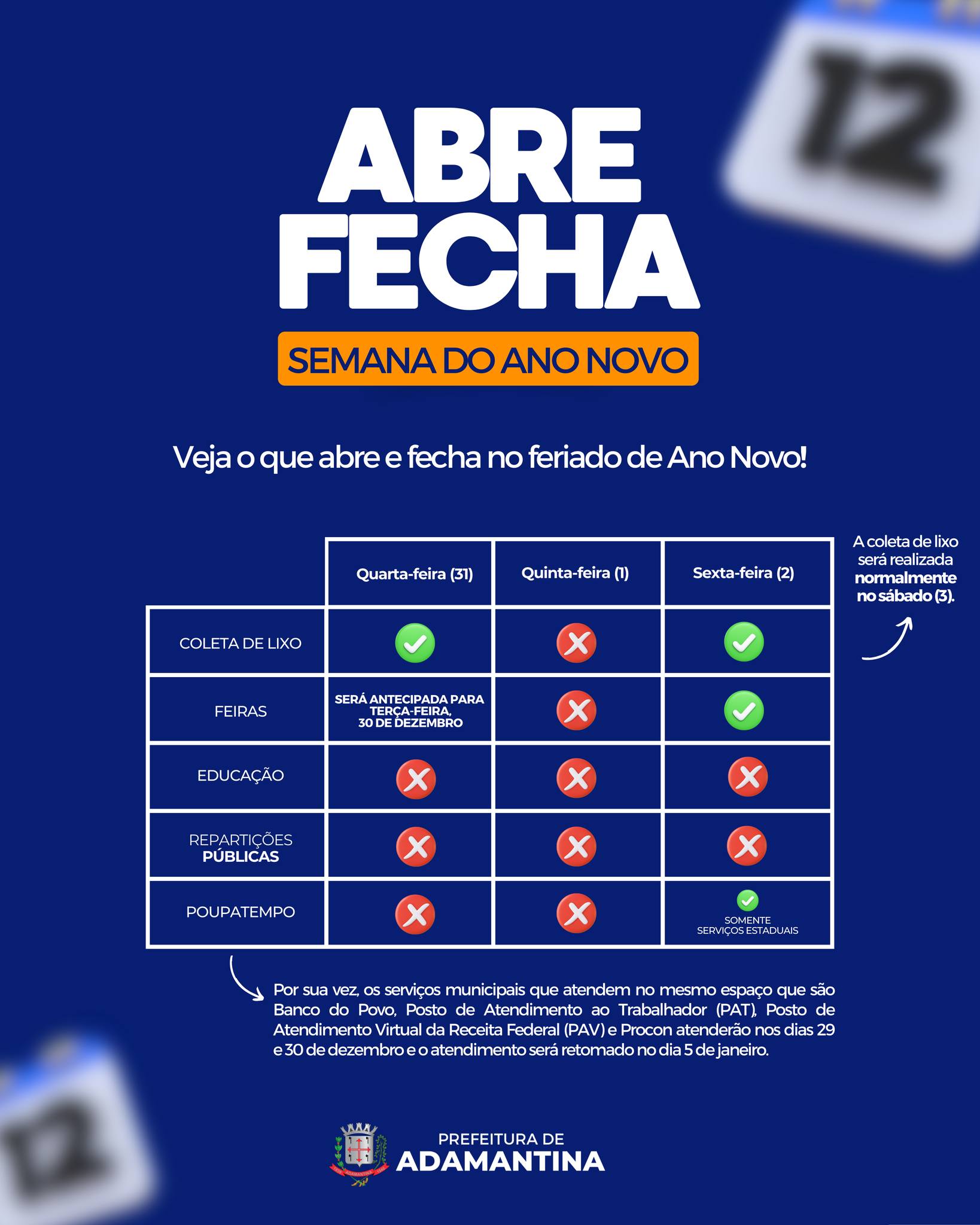 De acordo com o decreto 7.021 de 8 de novembro de 2024 e, ainda, conforme o decreto 7192 de 6 de novembro de 2025, o expediente no ano novo está suspenso nas repartições públicas da administração direta do município de Adamantina.
