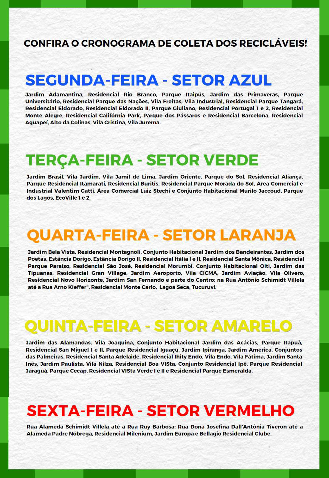 A partir de agora, a população deve então separar os itens que podem ser reciclados e colocarem para descarte no dia já definido conforme o cronograma em cada um dos bairros do município.