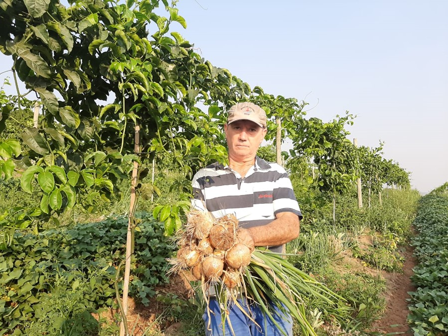 O produtor rural Cláudio Roberto Saia tem se mostrado satisfeito com o resultado da safra de cebola plantada entre os maracujazeiros (Cedida).
