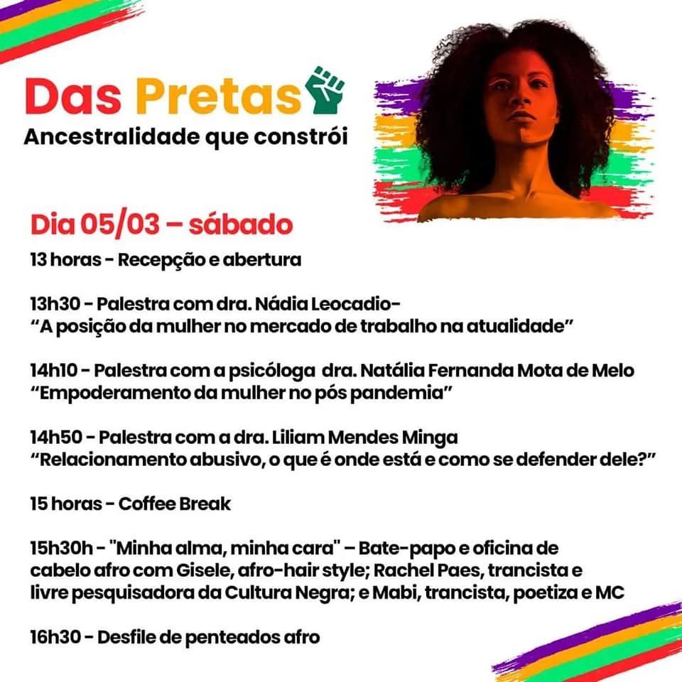 Nos dias 5 e 6 de março, será realizado o evento “Das Pretas – Ancestralidade que constrói” organizado pelo Grupo Gangazumba de Cultura Negra e Academia de Capoeira Estrela da Barra em comemoração ao Dia Internacional da Mulher que é celebrado no dia 8 de março. A Secretaria de Cultura e Turismo de Adamantina apoia a ação.