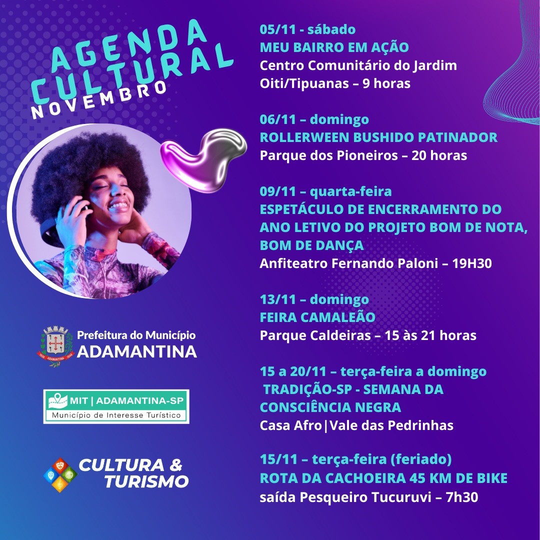 As atividades culturais em Adamantina continuam a todo vapor. Para novembro, serão realizadas diferentes programações. Confira a agenda cultural e participe!