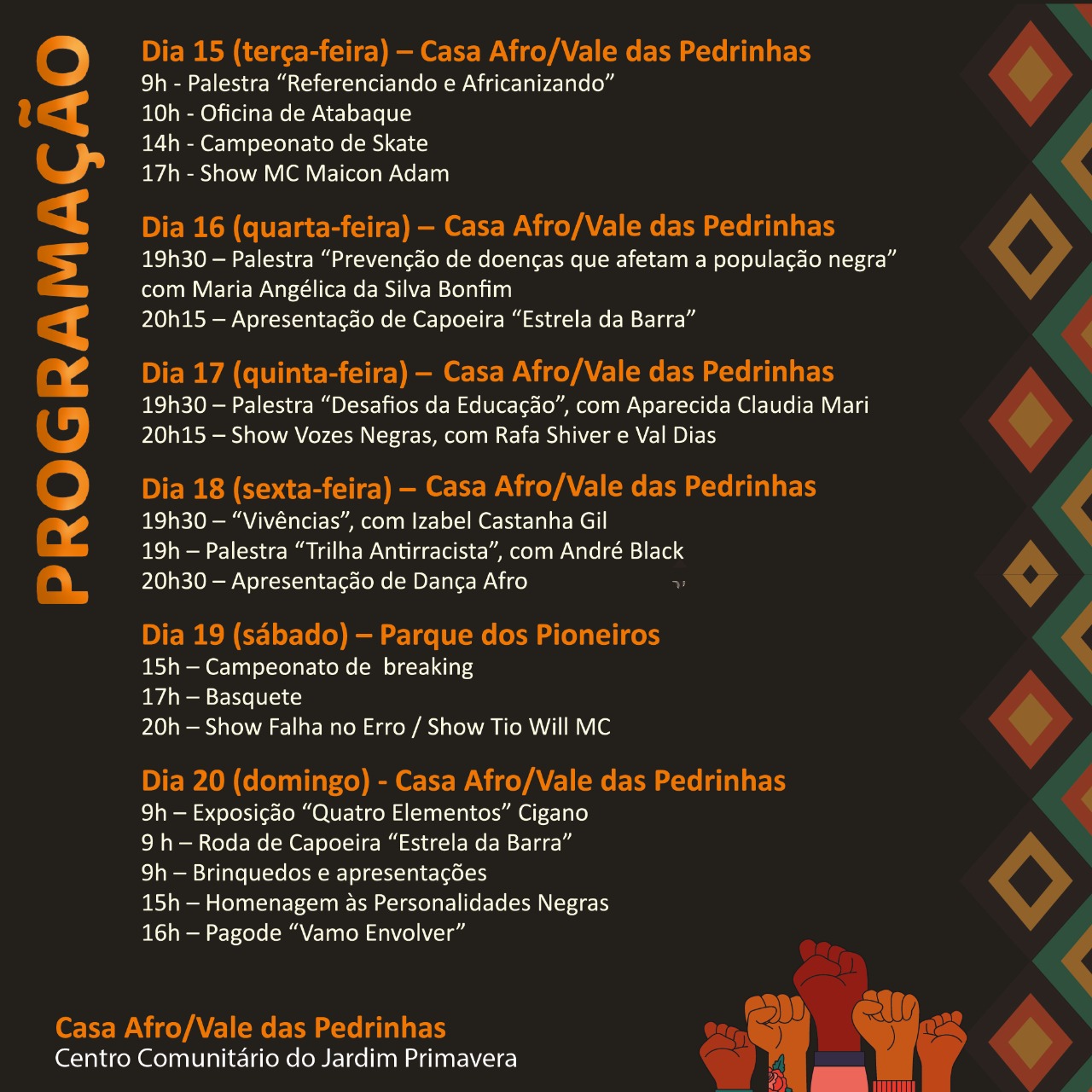 A programação do mês ainda traz a Semana da Consciência Negra com uma ampla relação de atividades que será realizada de 15 a 20 de novembro. No dia 15, terça-feira, feriado da Proclamação da República, acontece a Rota da Cachoeira 45 km de bike. A saída será no Pesqueiro Tucuruvi às 7h30.