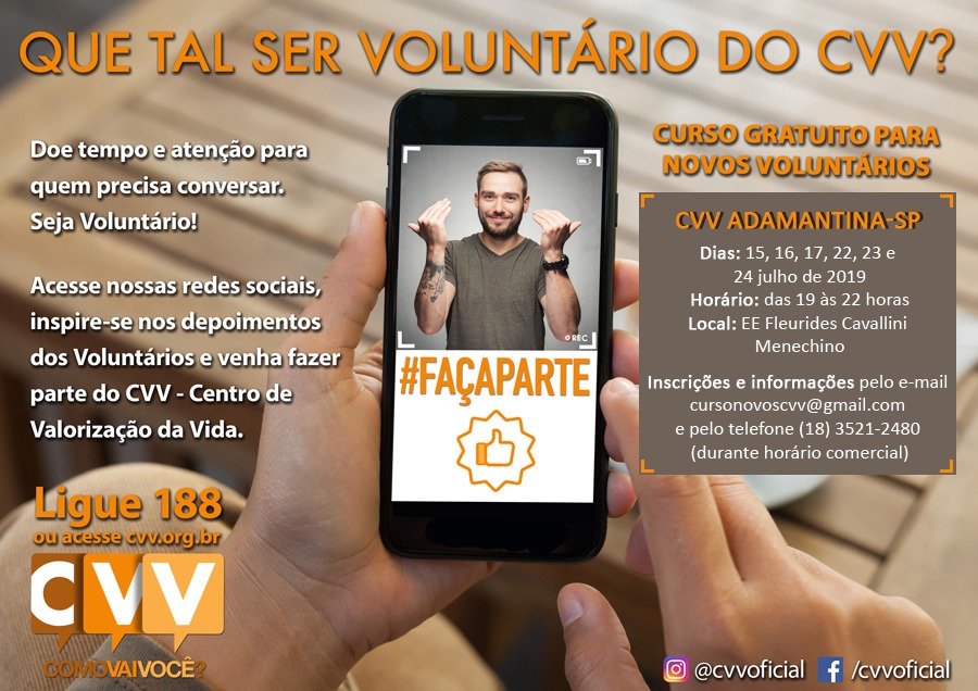 O Posto do Centro de Valorização da Vida (CVV) de Adamantina abre inscrições para formação de um novo grupo de voluntários, que poderá atuar no atendimento telefônico a chamados dirigidos ao número 188. A cidade conta com um posto do CVV, inaugurado em janeiro deste ano.