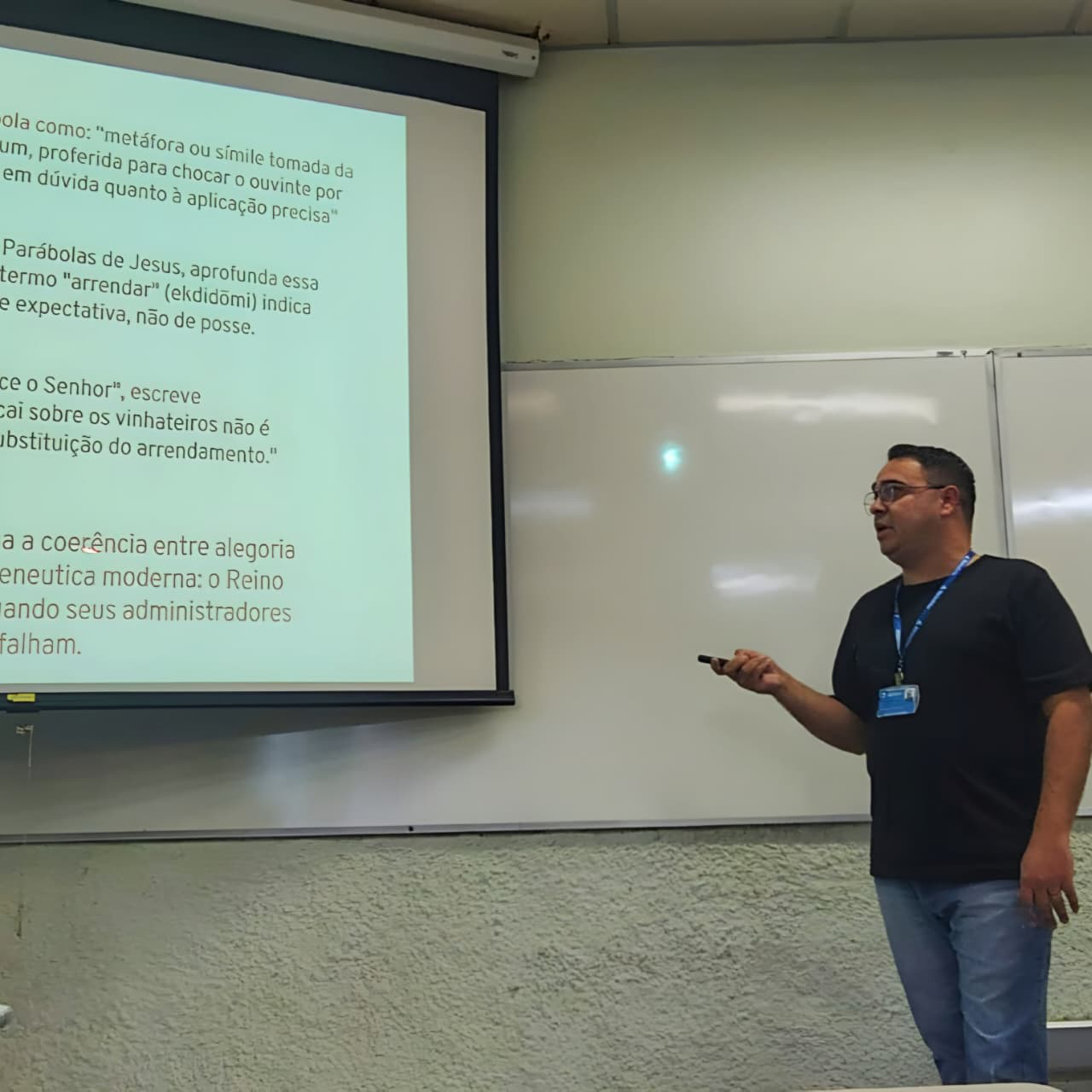 Em sua exposição, o pesquisador analisou a parábola dos vinhateiros maus (Mateus 21:33–46) sob a ótica da tradição patrística e da hermenêutica moderna, demonstrando como a leitura alegórica continua sendo um instrumento teológico legítimo e atual. Segundo ele, a alegoria não representa uma fuga do texto, mas um caminho espiritual de interpretação que conecta a revelação bíblica à experiência humana e eclesial contemporânea.