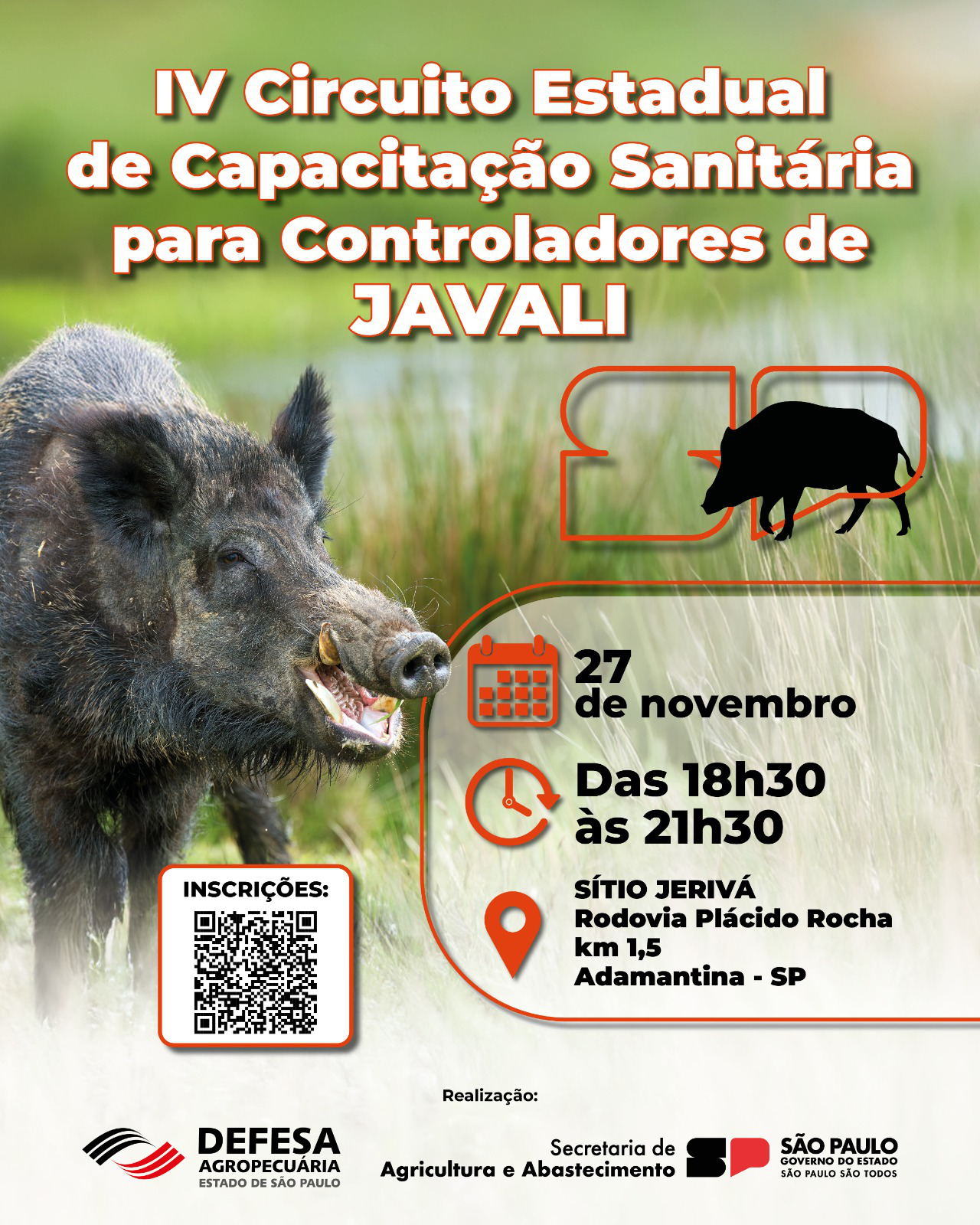 O encontro será realizado no Sítio Jerivá, na Rodovia Plácido Rocha, km 1,5, em Adamantina, das 18h30 às 21h30, e é destinado a controladores habilitados, produtores rurais e demais profissionais que atuam ou pretendem atuar no controle populacional do javali.