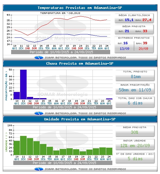 “O Governo do Estado de São Paulo, através da Coordenadoria Estadual de Defesa Civil informa: a aproximação de uma nova frente fria nos próximos dias volta a causar chuvas em todo o Estado de São Paulo. São previstas chuvas fracas e fraco-moderadas generalizadamente, bem como a formação de núcleos de chuva forte acompanhados de rajadas de vento e descargas elétricas. Esse novo sistema em associação com os acumulados de precipitação observados desde o início desta semana mantém elevado o potencial para novos transtornos e para o agravamento de problemas já existentes”.
