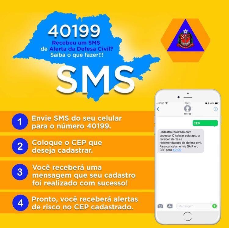 A Defesa Civil reitera que o morador pode se cadastrar para receber alertas via SMS. Veja como proceder: