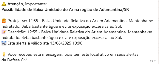 A Defesa Civil do Estado de São Paulo emitiu um alerta de baixa umidade do ar na região de Adamantina. O comunicado foi recebido às 13h51, com vigência até às 19h, enviado por aplicativo de mensagem aos usuários cadastrados.