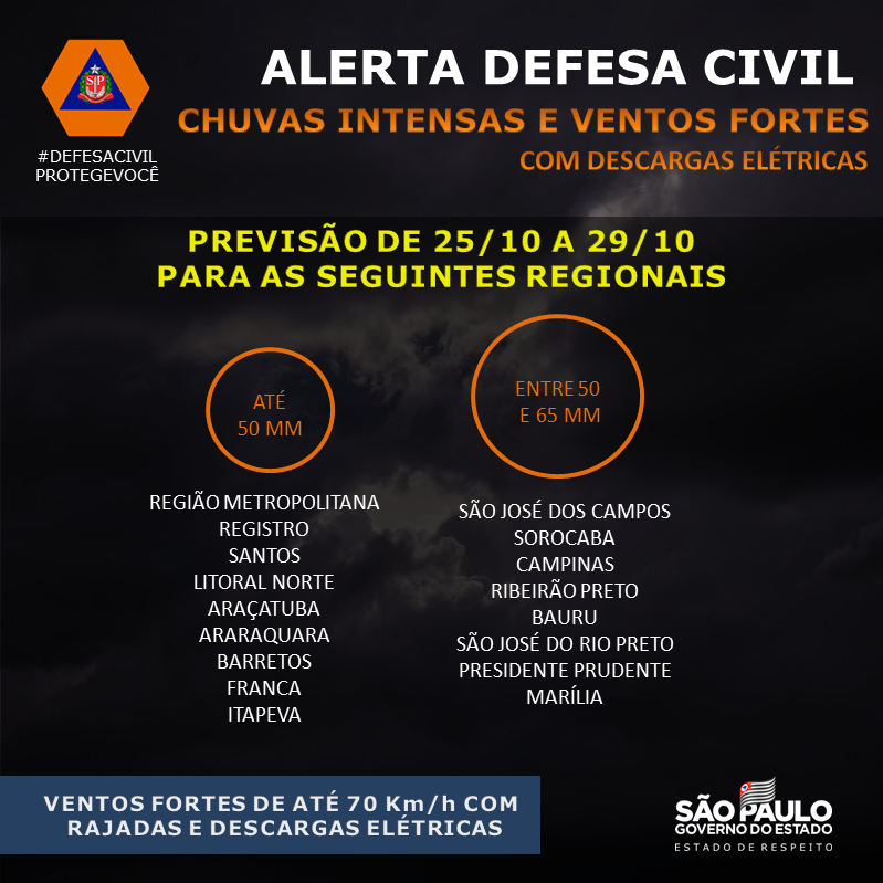 A Defesa Civil do Estado de São Paulo emitiu um alerta de chuvas intensas e ventos fortes com descargas elétricas. A previsão é válida desde esta sexta-feira (25) e segue até terça-feira (29), com possibilidade de chuva que pode chegar a 50 mm, ventos fortes de até 70 km/h com rajadas e descargas elétricas.