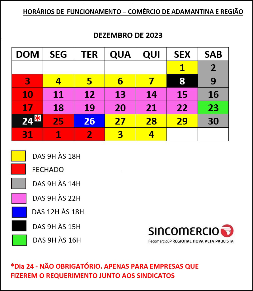 Foi divulgado pelo Sincomercio Nova Alta Paulista o calendário de funcionamento do comércio de Adamantina neste mês de dezembro, temporada especial de vendas, no fim do ano. Conforme o calendário, o funcionamento noturno, do setor, começa dia 11 e segue até o dia 22.