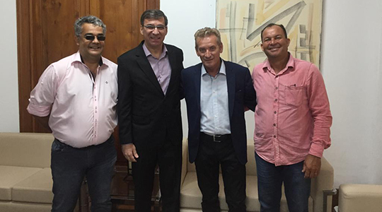 Prefeito Maciel Corpa, secretário da SAP Nivaldo Cesar Restivo, deputado Ed Thomas e vereador José Messias, na Secretaria da Administração Penitenciária (Reprodução/O Pacaembuense).