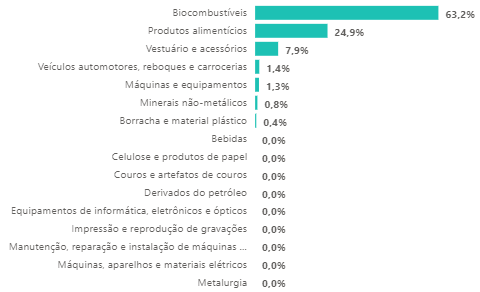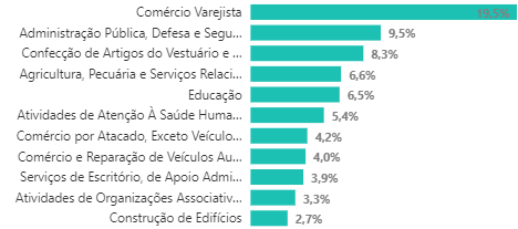 A maioria dos empregos está no comércio varejista (19,5%), depois na administração pública (9,5%) e indústria de confecções (8,3%), entre outros setores com menor representação na oferta de oportunidades de trabalho.