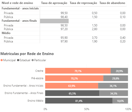 Na temática educação, há conteúdo sobre matrículas das redes municipal, estadual e particular; além de taxa de ocupação em creche, pré-escola e ensino fundamental e médio. Números alcançados pelas cidades no Índice de Desenvolvimento da Educação Básica (Ideb) entre os anos de 2015 e 2019 também são facilmente encontrados no site.