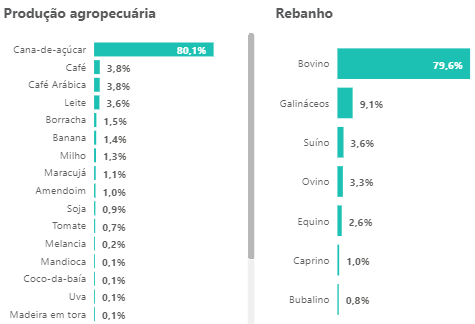 Na atividade industrial local, o segmento de biocombustíveis responde por 63,2%, o setor de produtos alimentícios por 24,9% e de vestuário e acessórios 7,9%. No segmento agropecuário, a cana de açúcar responde por 80,1% da área cultivada e entre o rebanho local, 79,6% são de bovinos.