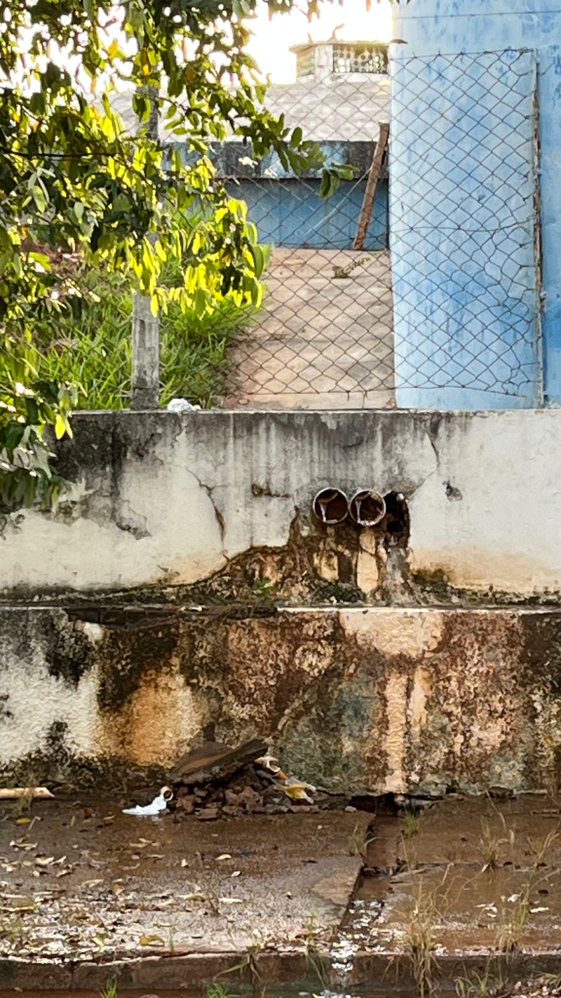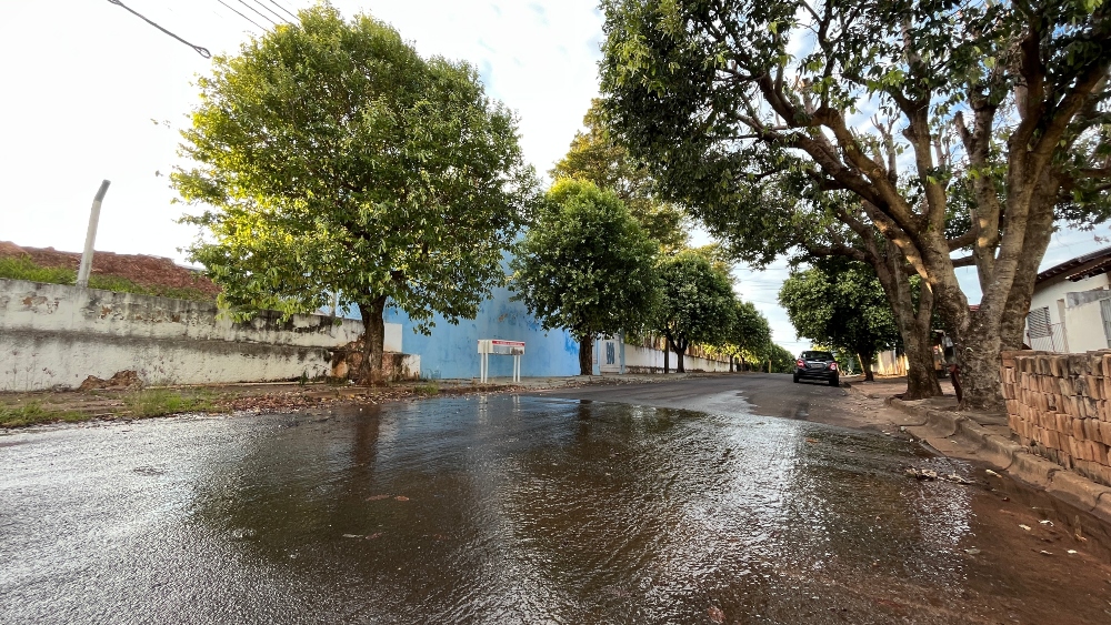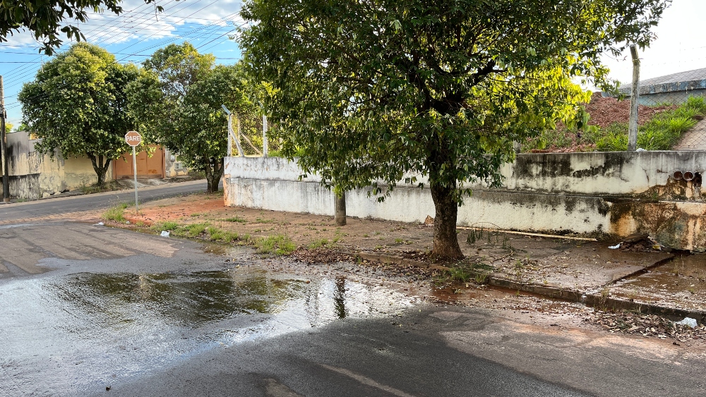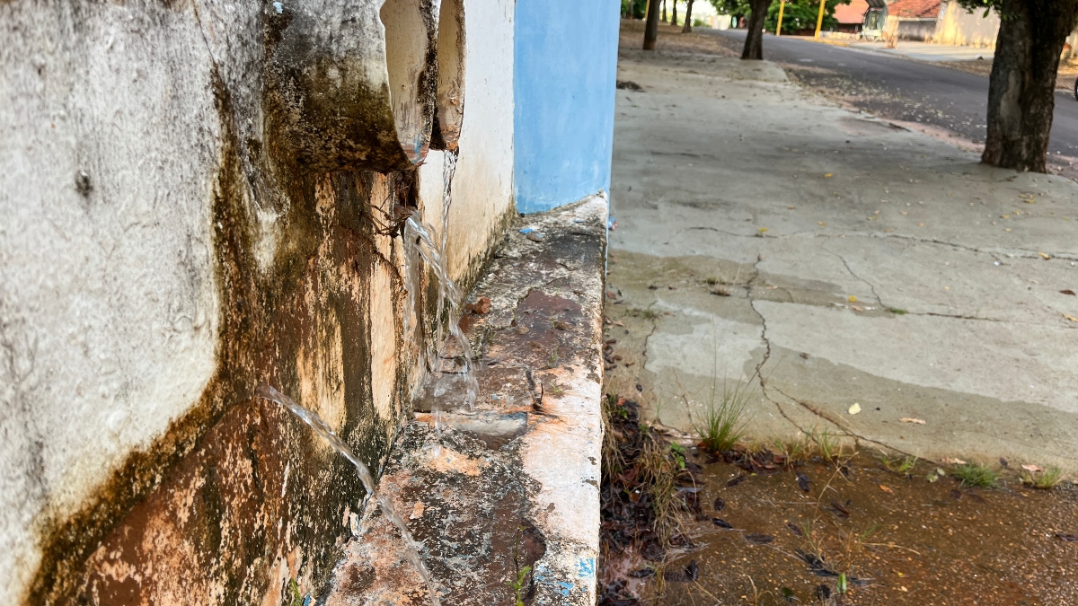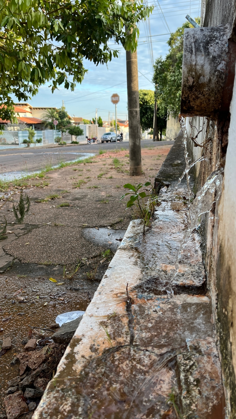 Conforme os moradores o vazamento ocorre há semanas, 24 horas por dia, sem parar. Do lado de fora não é possível identificar a origem do problema, porém o volume escorre por tubulação pluvial. A reportagem também verificou água vazando pela parede externa do muro, o que reforçou a suspeita de vazamento. De forma contínua, a água segue em gravidade pelo passeio público, atravessa a rua continua seu curso pela guia, do outro lado da via.
