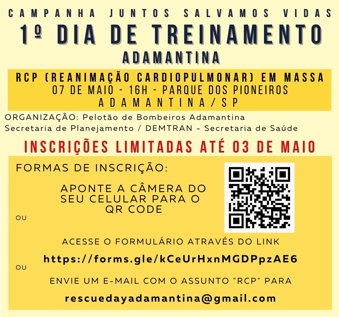 Com o objetivo de capacitar e instruir a população a atuar em casos de uma emergência, tanto no correto acionamento dos serviços de emergência como na aplicação de manobra de reanimação cardiopulmonar, a Prefeitura de Adamantina, por meio da Secretaria de Saúde e do Departamento Municipal de Trânsito (DEMTRAN), promove em parceria com o Pelotão do Corpo de Bombeiros de Adamantina a Campanha Juntos Salvamos Vidas - “1º Dia de Treinamento”.