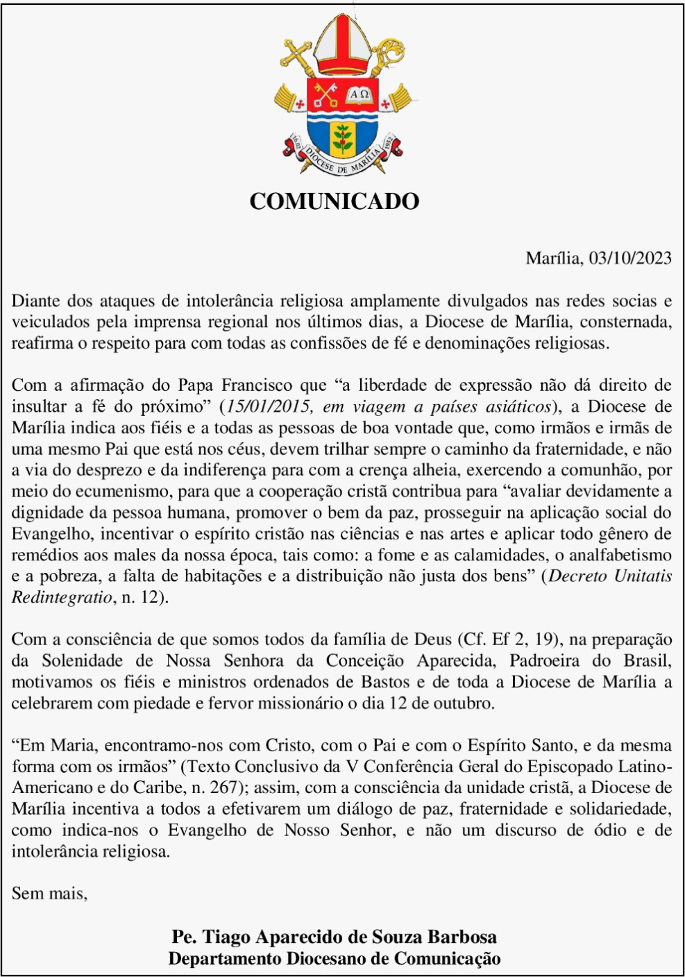 Veja na íntegra o comunicado da Diocese de Marília, publicado em sua fanpage: