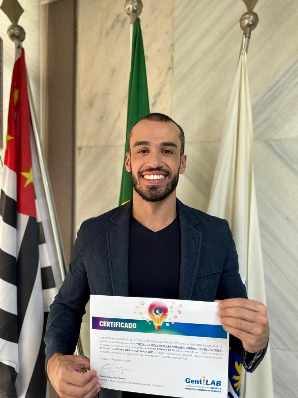 O adamantinense Lucas Bonora – que foi aluno de direito do Centro Universitário de Adamantina, atuou como escriturário na instituição e depois como advogado na comarca – conquistou na última quarta-feira (24), em Campinas, o primeiro lugar no Prêmio Gente Que Inova, com o Portal de Regularização Fundiária Urbana.