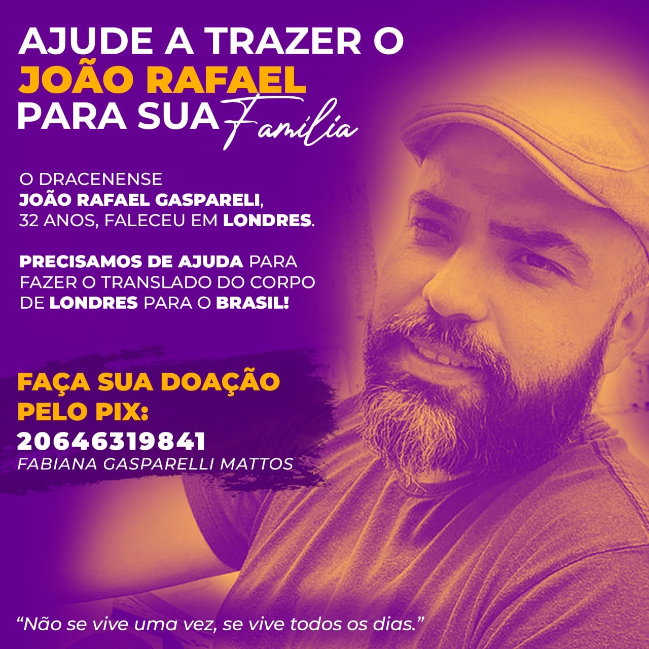 A morte do brasileiro João Rafael Gasparelli, de 32 anos, em Londres, mobiliza sua família em Dracena, que vive um drama para fazer o traslado do seu corpo, cujas despesas estão previstas em R$ 60 mil. Sem condições para bancar com os custos, a situação tem ampliado o sofrimento dos pais e parentes.