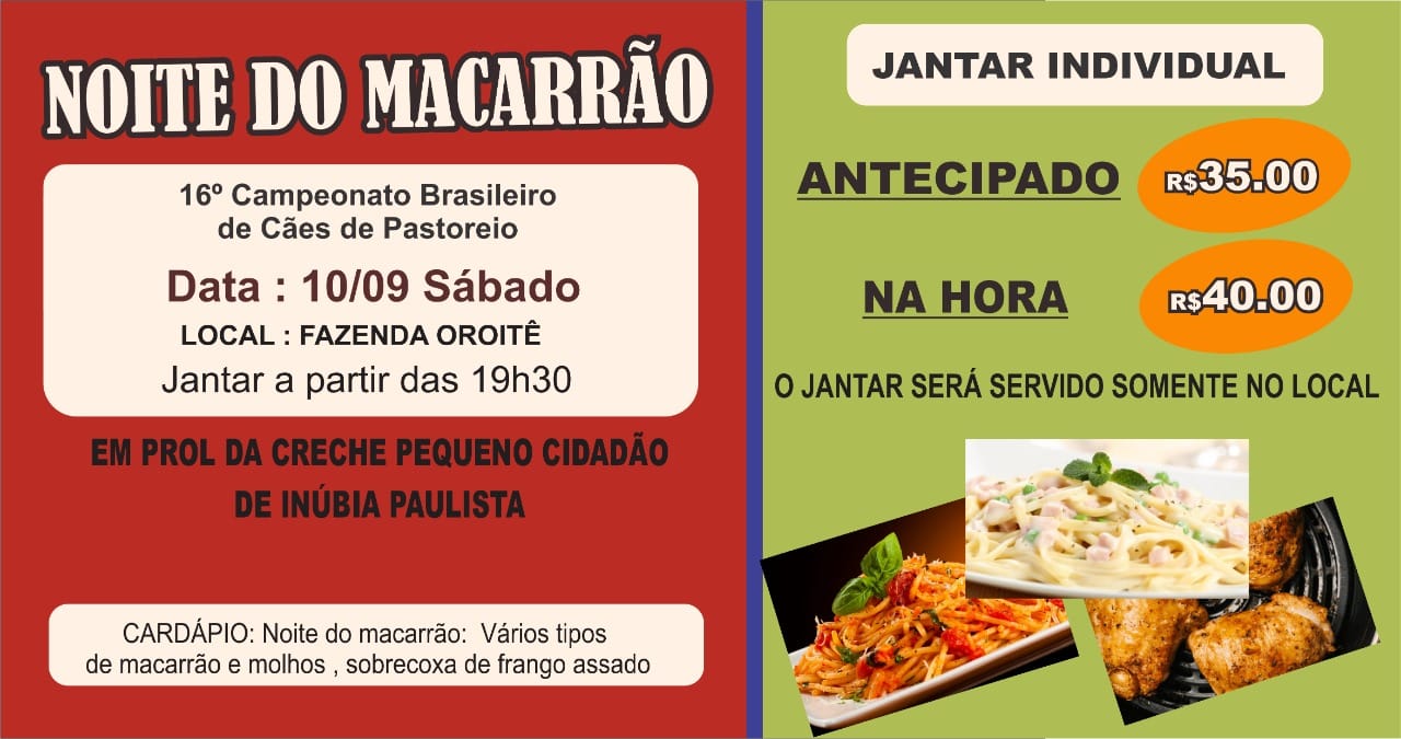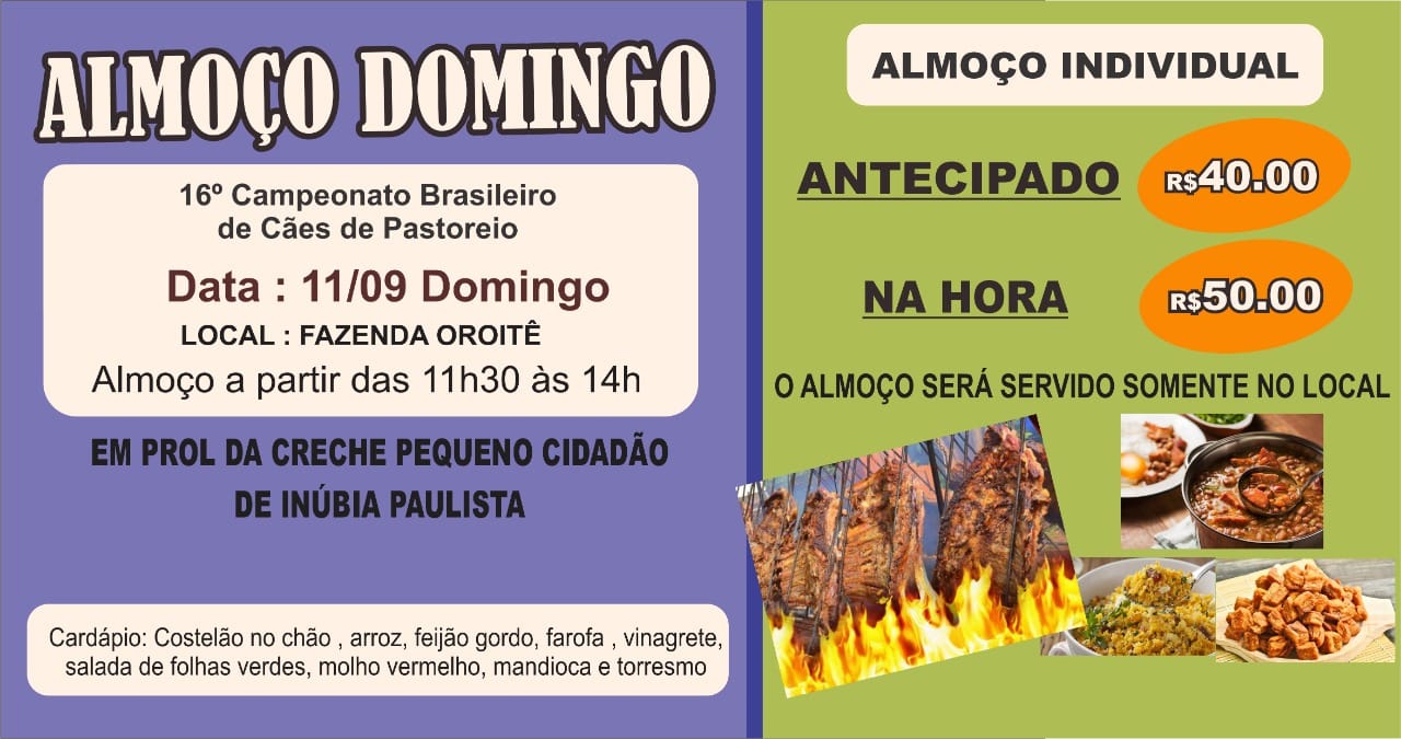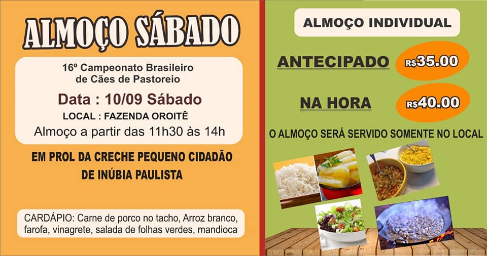 Até domingo, o público que participa do 16º Campeonato Brasileiro de Cães de Pastoreio tem no local uma praça de alimentação durante todo o dia, com barracas de pastel e sorvetes. Estão previstos também dois almoços (de sábado e domingo) e um jantar (de sábado), com convites à venda antecipadamente ou no local. A renda é beneficente ao Lar Batista e Creche Pequeno Cidadão, ambos de Inúbia Paulista. Veja mais: