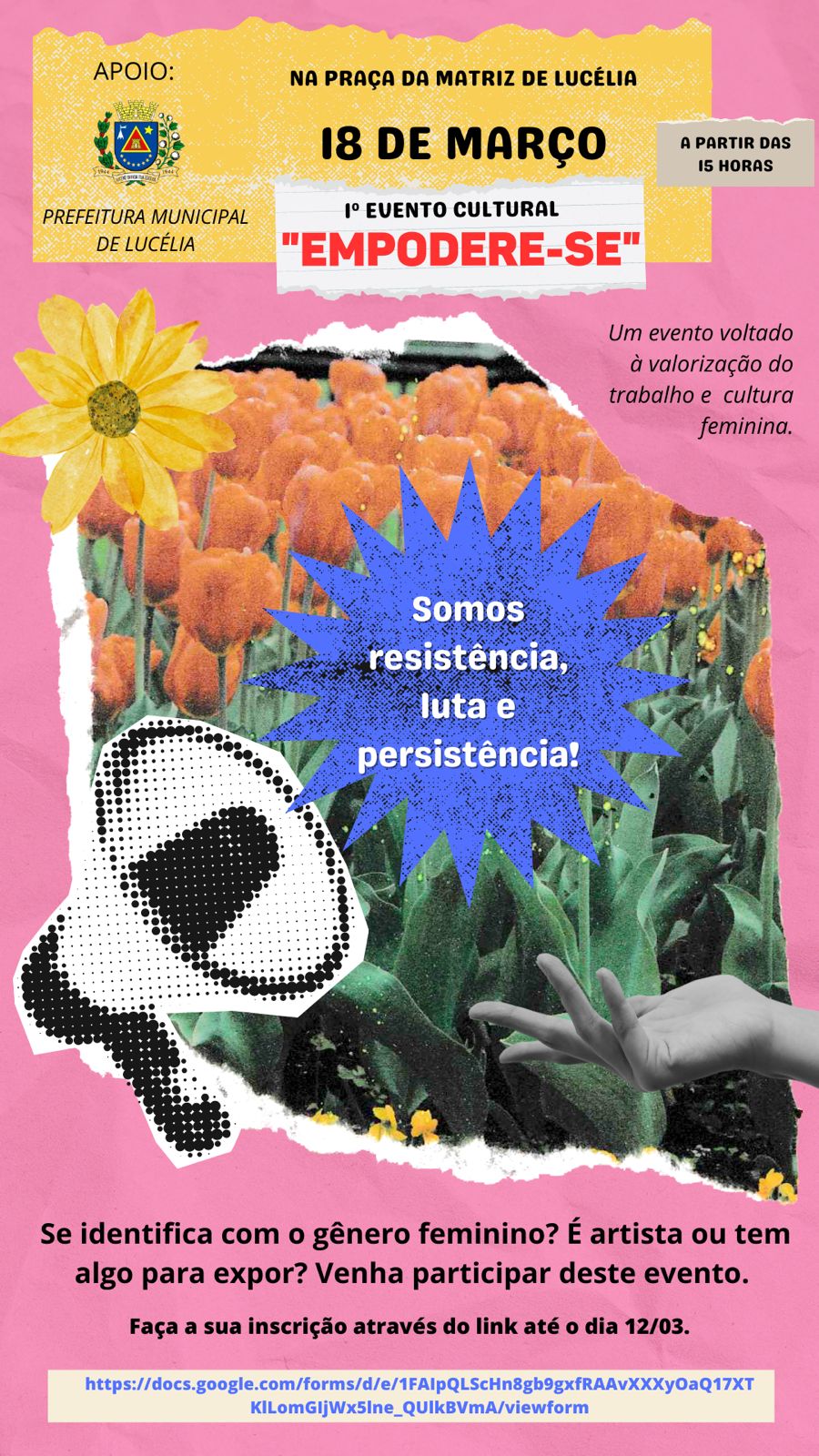 Acontece no próximo sábado (18) em Lucélia o evento cultural “Empodere-se”, uma ação voltada à valorização do trabalho e cultura feminina. A atividade acontece na praça da Igreja Matriz, a partir das 15h.
