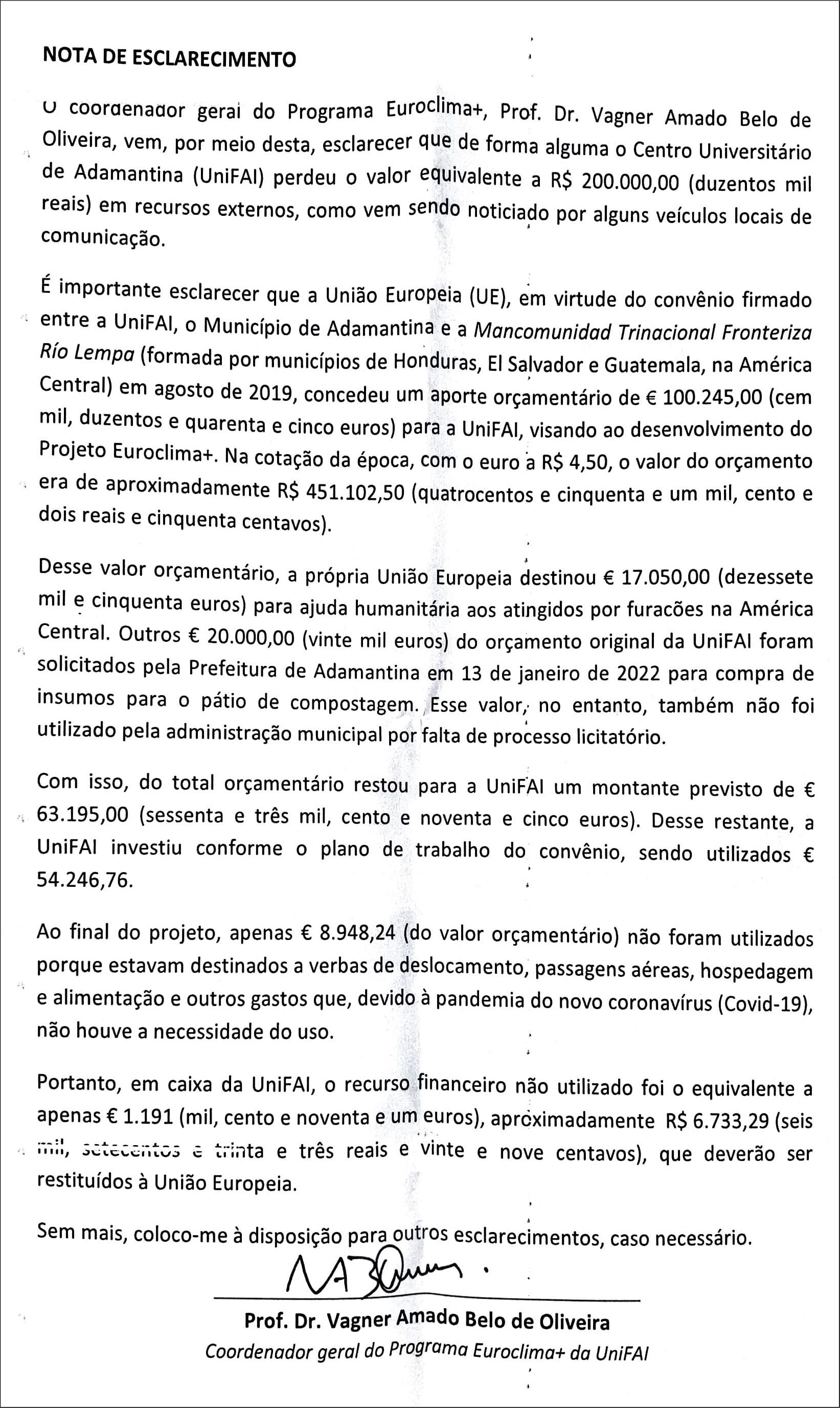 “O Centro Universitário de Adamantina (UniFAI) vem, por meio desta, esclarecer que não há qualquer fundamento na informação que vem sendo noticiada por alguns veículos locais de comunicação nos últimos dias de que esta Instituição teria supostamente perdido o equivalente a R$ 200 mil em repasses do Programa Euroclima+ e estaria prestes a perder mais R$ 1 milhão em emenda parlamentar. Os números, aliás, sequer condizem com a realidade.