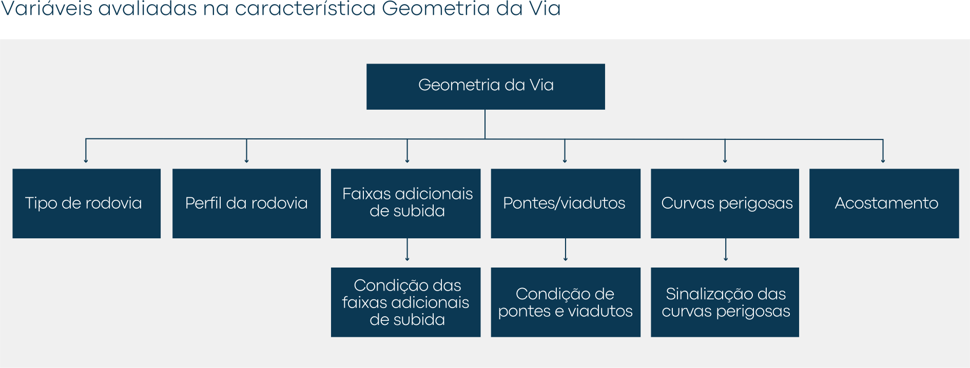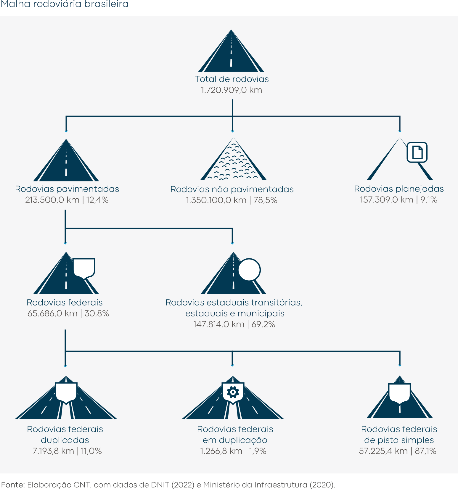 Em toda a malha pesquisada, foi observada uma piora significativa na característica Pavimento em relação ao resultado de 2021. A CNT identificou que 55,5% (61.311 quilômetros) da extensão encontram-se em estado regular, ruim ou péssimo, um acréscimo de 3,3 pontos percentuais em relação ao ano anterior. Para a sinalização, 60,7% (66.985 quilômetros) foram considerados deficientes (regular, ruim ou péssimo), enquanto para geometria da via, este valor corresponde a 63,9% (70.445 quilômetros).
