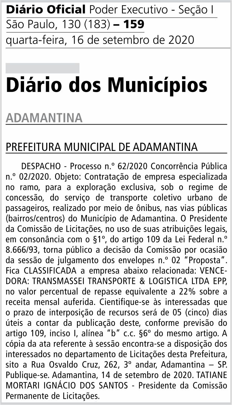 A empresa Transmassei Transporte & Logistica Ltda EPP deve operar o transporte coletivo de passageiros em Adamantina. Segundo publicou a Prefeitura local no Diário Oficial do Estado de São Paulo nesta quarta-feira (16), a empresa foi declarada vencedora da Concorrência Pública n.º 02/2020. Segundo a Lei de Licitações, abre-se agora um prazo para recursos. A decisão final depende dos atos de adjudicação e homologação do processo licitatório, para que então possa ser assinado o contrato.