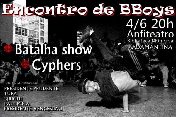 Neste sábado (4), às 20h30, no Anfiteatro da Biblioteca Municipal, acontecerá o “Encontro de BBoys - Batalha Show e Cyphers”, promovido pela Cia Super Star BBoys em parceria com a Secretaria de Cultura e Turismo de Adamantina, dentro do calendário de aniversário dos 67 anos de Adamantina.