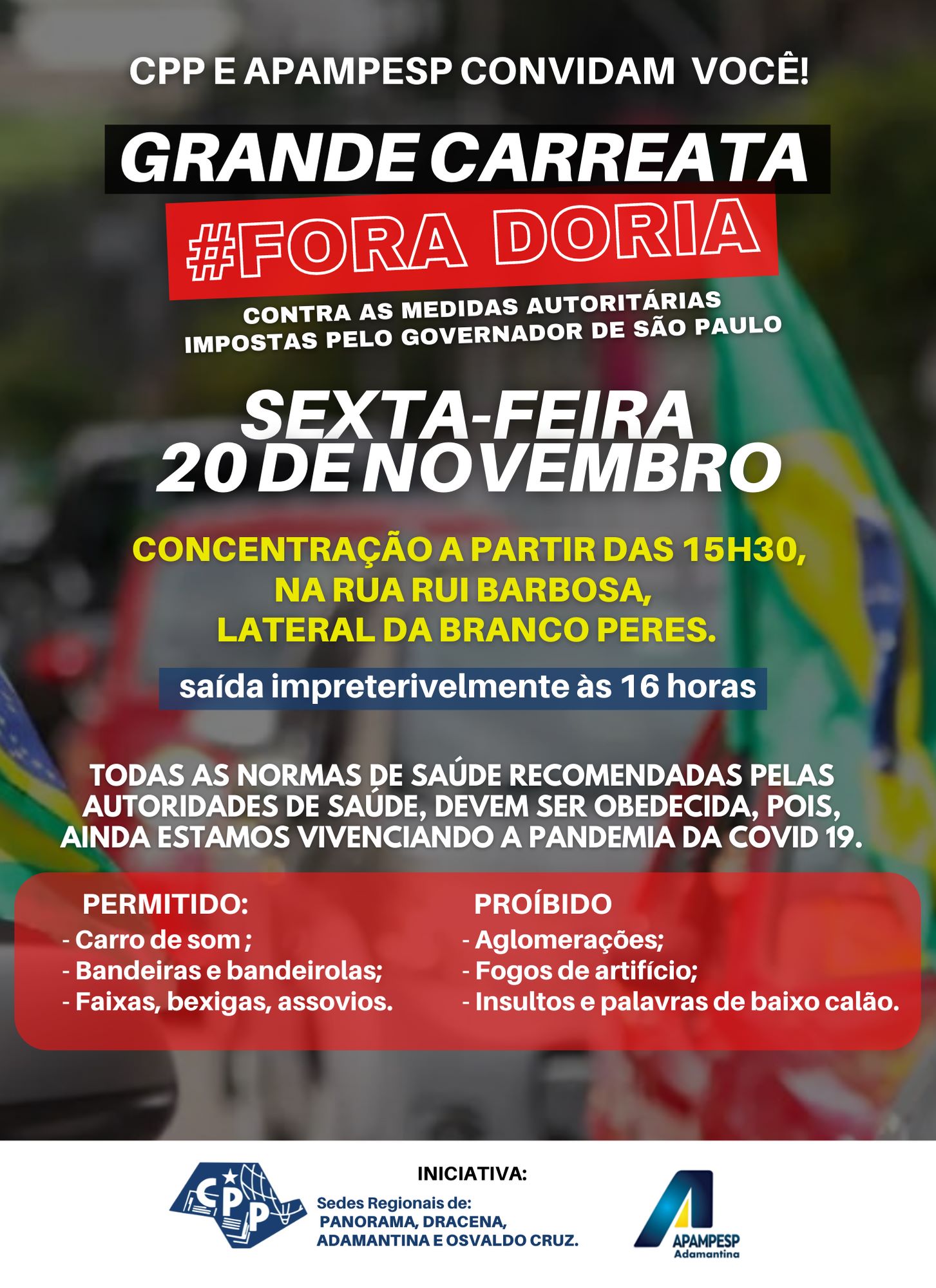 Em Adamantina, a carreata "A força que vem do interior - #ForaDoria" terá sua concentração a partir das 15h30 desta sexta-feira na Rua Rui Barbosa, proximidades do cruzamento com a Avenida Rio Branco (ao lado do Branco Peres). A convocação da manifestação é assinada pelas sedes regionais do CPP de Panorama, Dracena, Adamantina e Osvaldo Cruz, e a sede regional da Apampesp (Associação de Professores Aposentados do Magistério Público do Estado de São Paulo), de Adamantina.